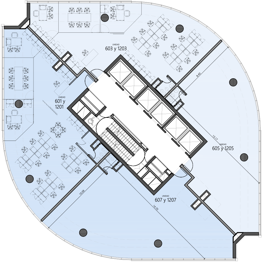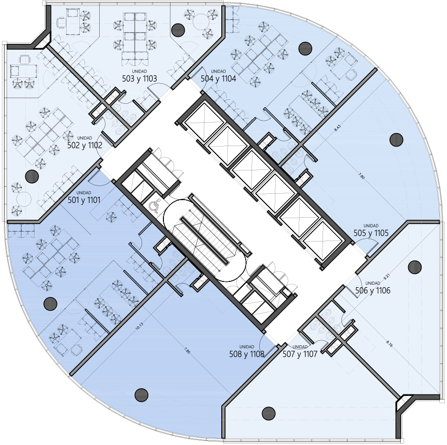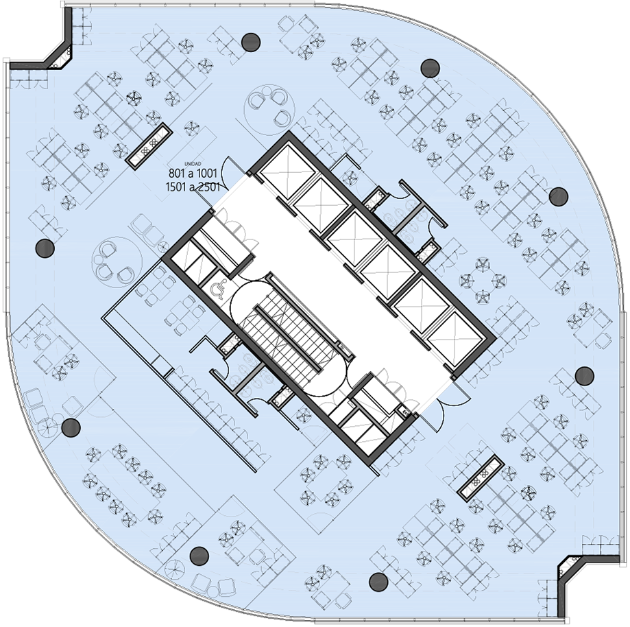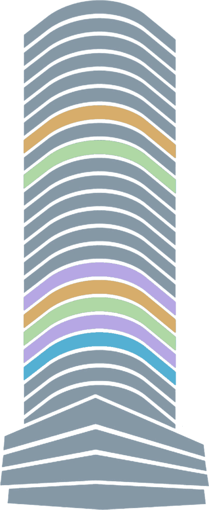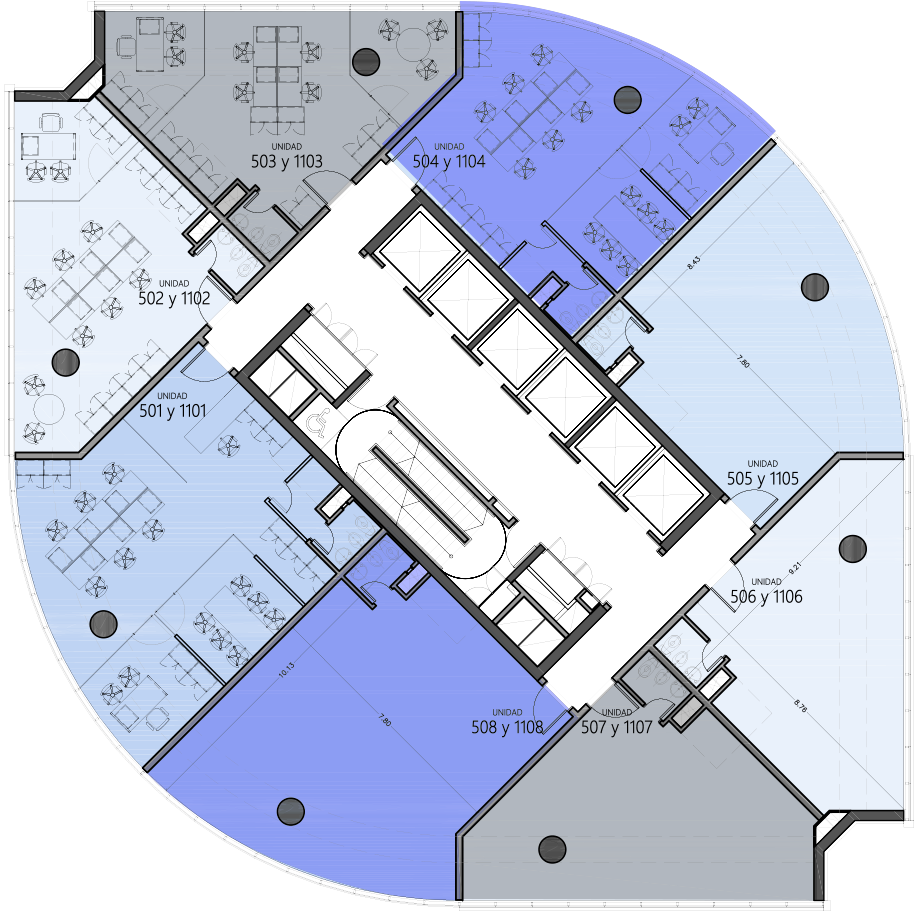Planta dividida en cuatro unidades que van desde los 130 hasta los 180 m2. Cada planta ofrece el escenario perfecto: conexiones prontas y vistas espectaculares para potenciar tu proyecto.